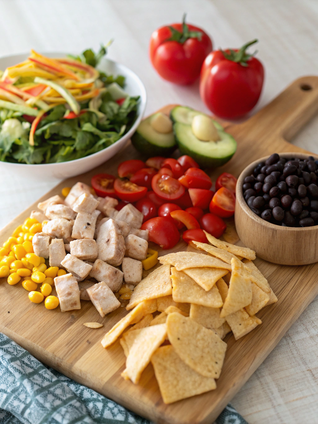 In a large bowl, combine chopped romaine, black beans, corn, bell pepper, red onion, and cherry tomatoes. Toss gently to distribute ingredients evenly. This colorful base provides six different antioxidant sources, maximizing your nutritional intake with each bite.